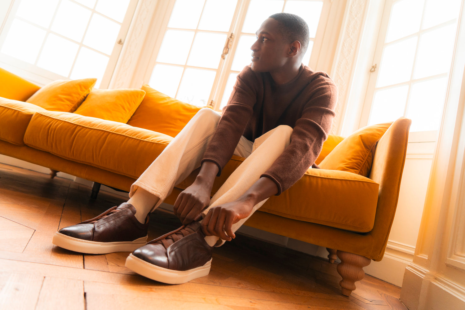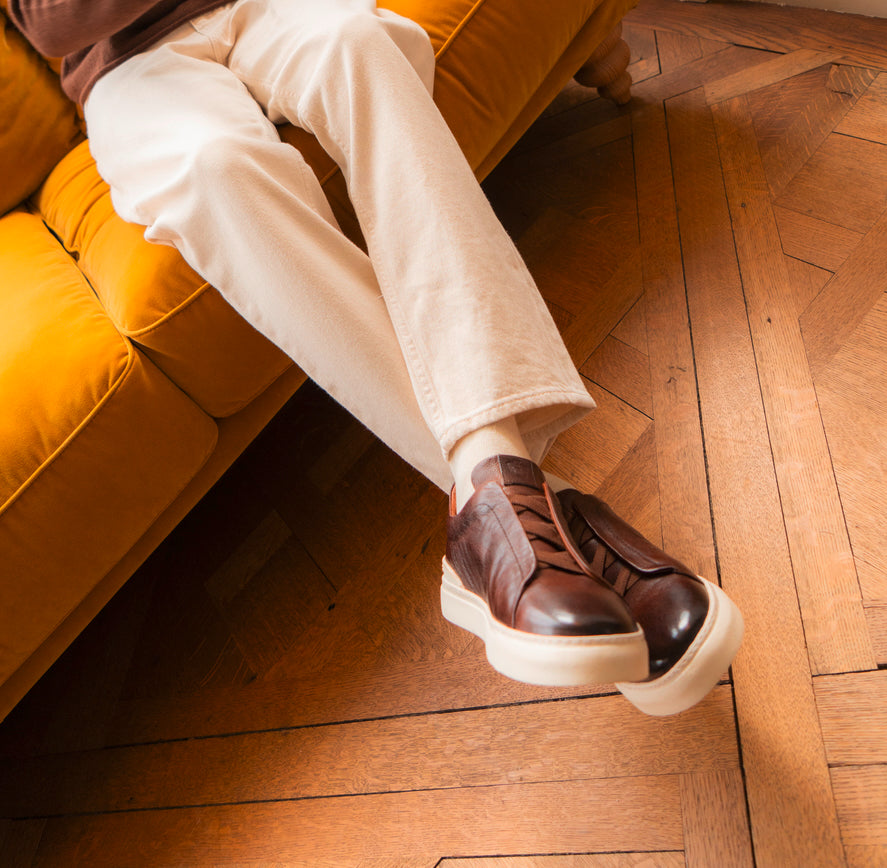 Cuir lisse : essuyez avec un chiffon humide puis laissez sécher. Appliquez une petite quantité de crème nourrissante pour hydrater et nettoyer le cuir ; une fois absorbée, utilisez un cirage pour plus de brillance ou pour raviver la couleur. Utilisez des embauchoirs et alternez vos paires. Évitez les sprays à base d’alcool.