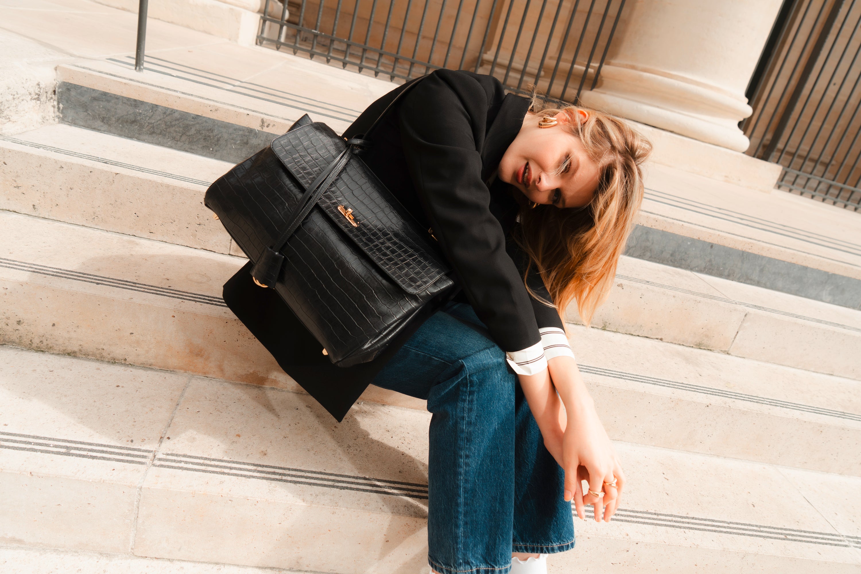 - Interior: 2 grands compartiments, 1 poche zippée, 2 petites poches