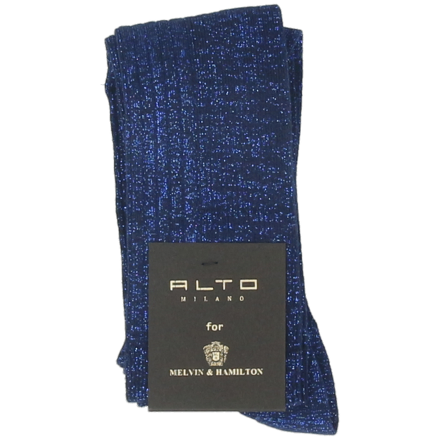 Craquez pour les chaussettes longues Menton en bleu, leur coupe haute et leur design unique. Avec leur aspect à la fois côtelé et pailleté, ce modèle apportera la touche glamour et féminine pour parfaire votre look. Dessinées et fabriquées par Alto Milano pour Melvin & Hamilton, les chaussettes Menton sont constituées à 80% de coton, ce qui en fait une chaussette confortable et agréable au quotidien.